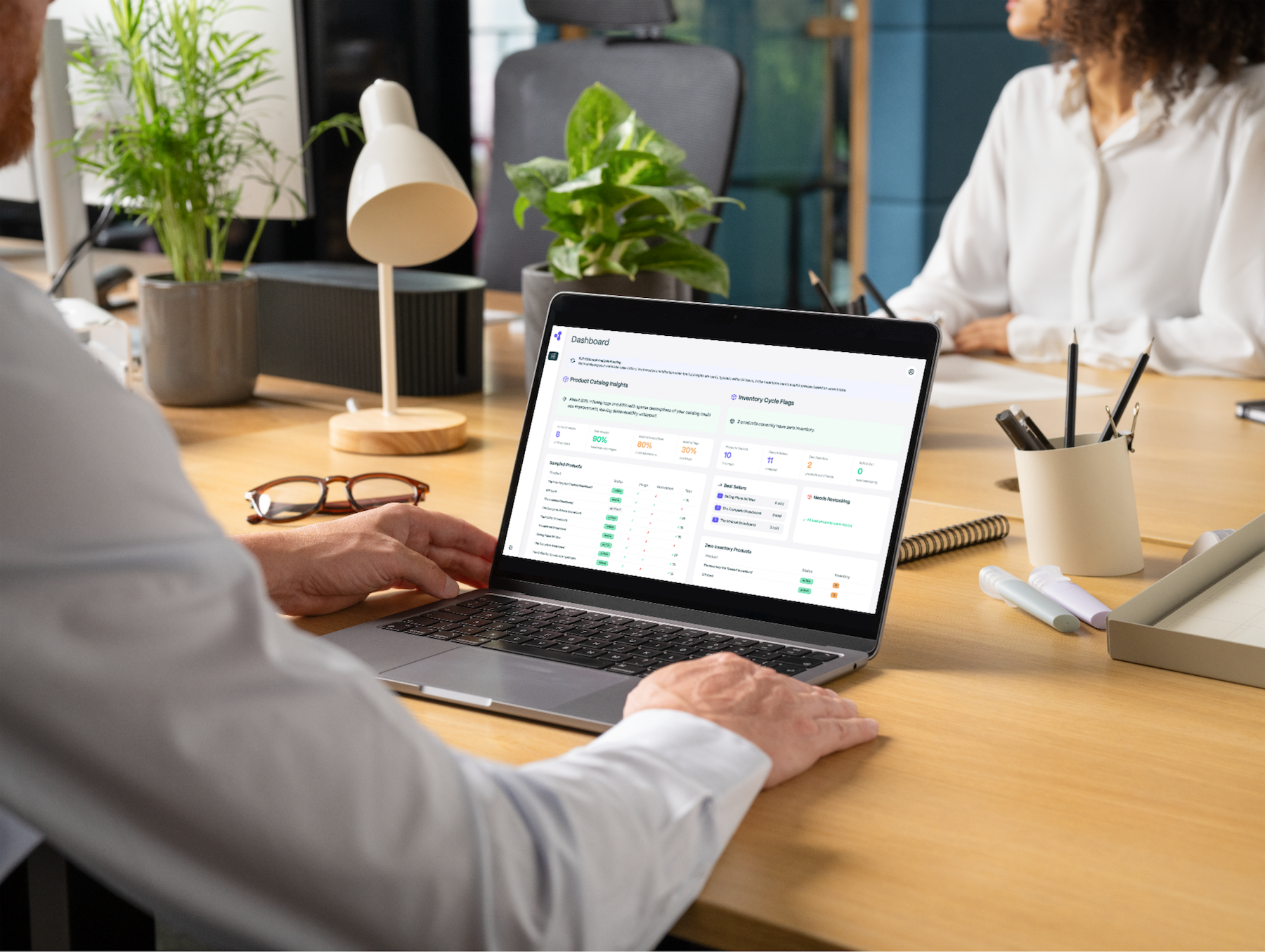 An instant AI dashboard highlights catalog quality, inventory issues, customer mix, and sales signals.